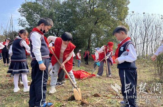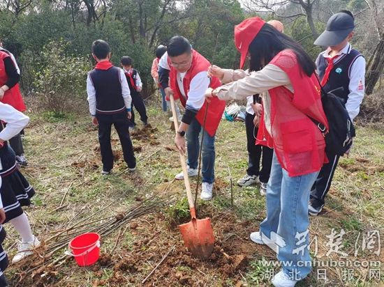 荊楚網(wǎng)(湖北日?qǐng)?bào)網(wǎng))訊(通訊員 王小忠)3月10日,鄂州市新民街小學(xué)師生50余人在學(xué)校少工委組織下,來(lái)到澤林東佛園藝林場(chǎng),開(kāi)展“擁抱春天 播種綠色 放飛希望”義務(wù)植樹(shù)活動(dòng)。