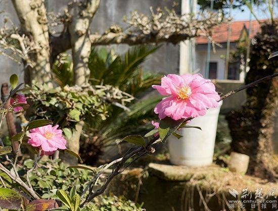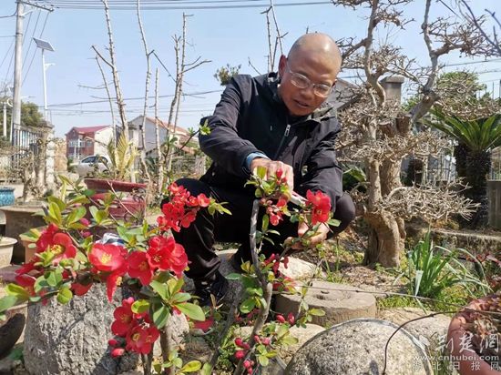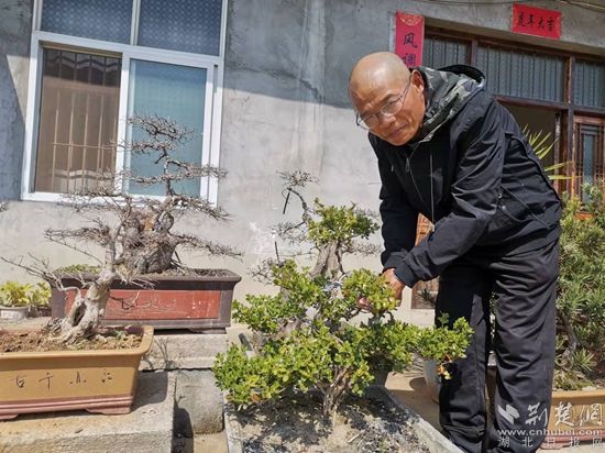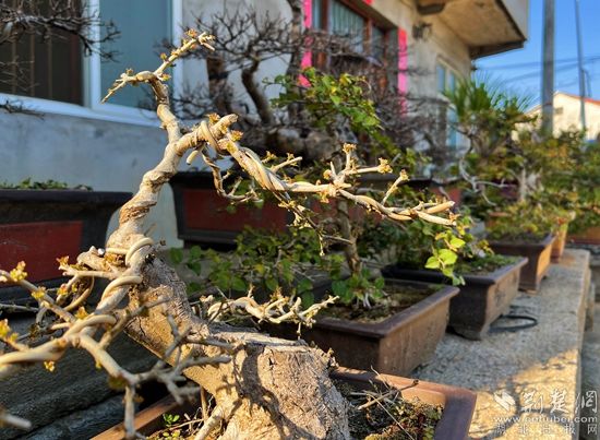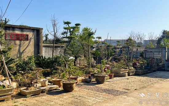 3月12日,記者在鄂州市華容區(qū)“最美家庭”得主——?jiǎng)㈦p全的院內(nèi)見到,數(shù)十種盆景依路排開。