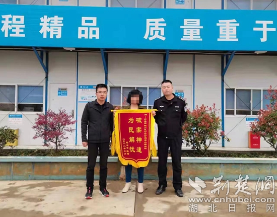 劉女士將一面寫有“破案神速、為民解憂”的錦旗送到該轄區(qū)派出所民警手中。通訊員供圖