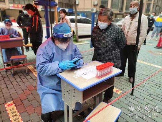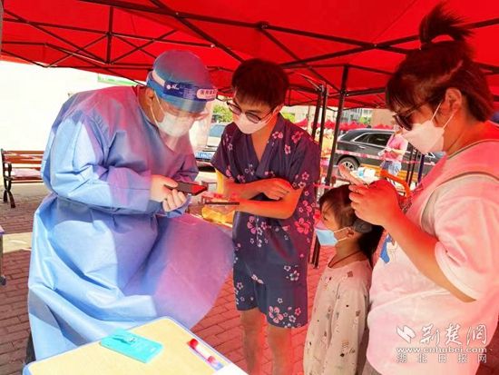 到達(dá)指定檢測(cè)點(diǎn),還來(lái)不及吃早飯的她早已全副武裝,穿上藍(lán)色防護(hù)服,戴上透明面罩,為參與混檢的居民錄入信息,掃健康碼。兩個(gè)小時(shí)過(guò)去了,混檢結(jié)束,脫下防護(hù)服的她臉上多了幾條長(zhǎng)長(zhǎng)的勒痕,頭發(fā)早已濕透,她開(kāi)玩笑說(shuō)這是“英雄的勛章”。