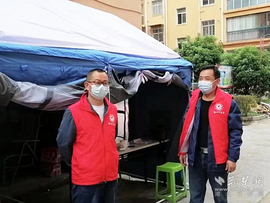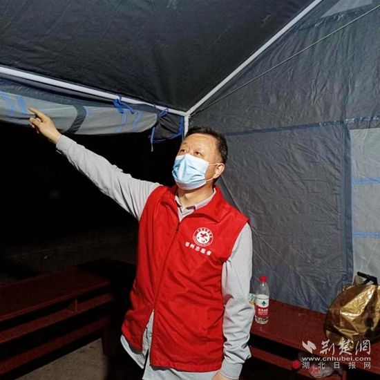 4月12日,實(shí)施靜態(tài)管理的第三天,鄂州天氣突變,氣溫驟降十余度。樊友明和羅福齊一同負(fù)責(zé)當(dāng)晚的夜班,夜里風(fēng)雨交加,臨時(shí)搭建的帳篷有些不穩(wěn)固,在風(fēng)雨中飄搖。雨越下越大,帳篷開始漏水,倆人幾乎一宿沒睡。第二天早上,幫助加固好帳篷,樊友明才匆匆離開。