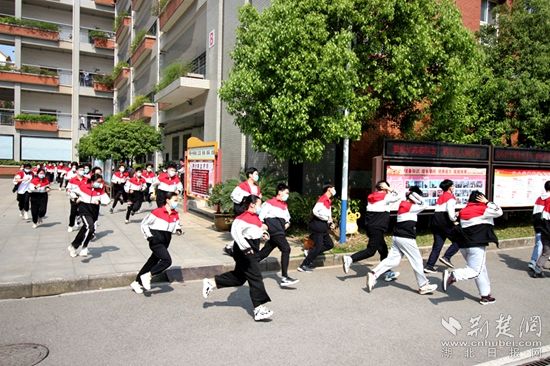 上午10時(shí)整,操場(chǎng)上一陣緊急火災(zāi)警報(bào)響起,學(xué)生們?cè)诶蠋煹闹敢拢孀”强?、彎著腰、從教學(xué)樓的兩側(cè)疏散通道,迅速撤離到操場(chǎng)上。