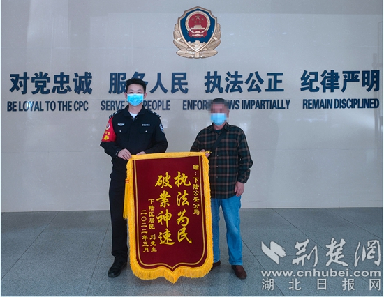受害人將一面錦旗送到民警手中。通訊員 供圖