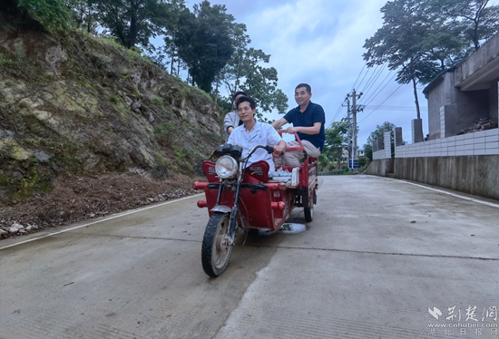尹傳波騎著三輪車帶陽(yáng)新殘聯(lián)理事長(zhǎng)劉富華(右)到村民家體驗(yàn)出診。這樣的出診,尹傳波默默干了16年。通訊員 供圖