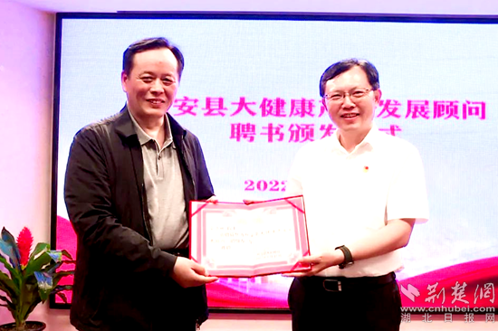 紅安縣委副書記、縣長(zhǎng)胡廣為仝小林院士頒發(fā)聘書。通訊員 供圖