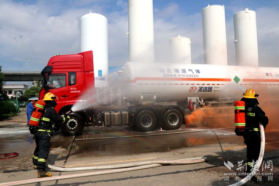 演練模擬高溫天氣工人裝卸液化氣操作不當,引發(fā)火災(zāi),火勢蔓延危及臨近廠區(qū)安全。企業(yè)隨即啟動應(yīng)急救援預(yù)案,組織企業(yè)微型消防站撲救初起火災(zāi)并撥打119進行報警。