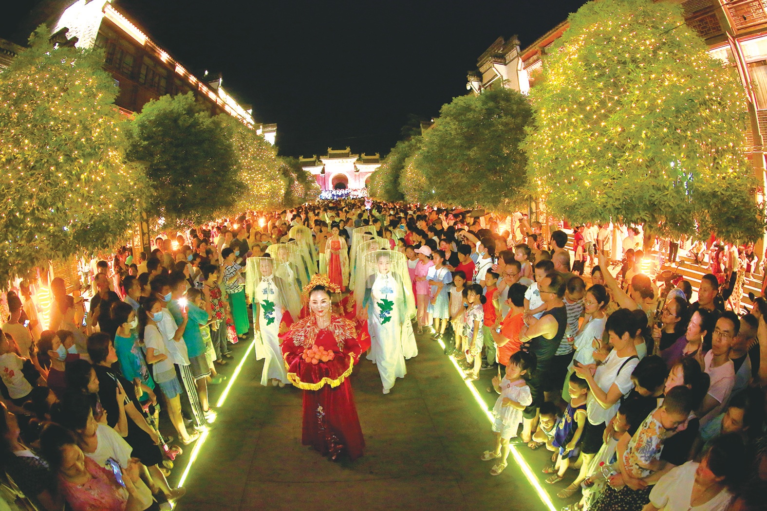 15日至16日晚,在武當(dāng)山玉虛街舉行的非遺廟會,點亮夜經(jīng)濟(jì)。除了極具看點的武當(dāng)非遺文化展演,無人機天幕秀也令人震撼,此外,琳瑯滿目的美食極大滿足了游客的味蕾體驗,紅火熱鬧的玉虛街已成為游客夜游武當(dāng)?shù)拇蚩ǖ?。圖/記者 朱江 特約記者 范學(xué)峰