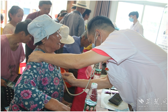 當天恰逢“大暑”,烈日炎炎,山路崎嶇,隊員們穿著白大褂、志愿者馬甲,攜帶診療設備、健康資料,到達黨員活動中心時已經(jīng)汗流浹背,但他們顧不上喝一口水,立即各司其職:義診、量血壓、測血糖、按需贈送藥品,志愿者們忙著維護秩序,引導大家保持適當距離,幫扶行動不便的老人。