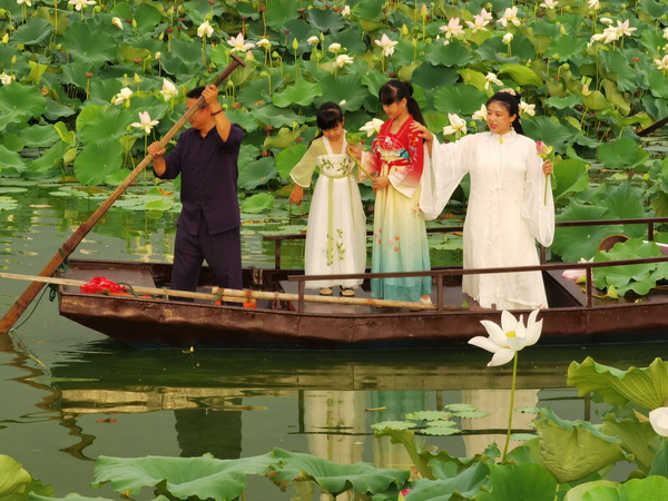 “武當可采蓮,蓮葉何田田?!痹谖洚斏教珮O湖濕地公園,百畝荷花競相開放,微風輕拂,碧波蕩漾,花香四溢,為炎炎夏日增添了詩意。身著漢服的古琴師帶著兩名采蓮少女,泛著小舟,暢游在花海,采摘蓮子和荷葉,為即將制作的消夏納涼荷花茶、消暑湯做準備,體驗不一樣的大暑節(jié)氣,勾勒出一幅美妙的圖畫。