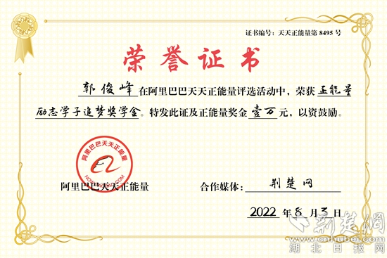 阿里巴巴正能量勵(lì)志學(xué)子追夢(mèng)獎(jiǎng)團(tuán)隊(duì)專門為郭俊峰定制了頒獎(jiǎng)詞:12歲,父母雙雙溺亡,晴天霹靂,擊中了這個(gè)原本幸福富裕的家。來(lái)不及裝修的毛坯房里,四面灰撲撲的墻,籠住了一顆幼小破碎的心。18歲,少年高分錄取,八旬奶奶,多少含辛茹苦終于得到回報(bào)。她走街串巷,片片綠油油的菜葉,換回少年夢(mèng)想的門票。祖孫倆相依為命,這一路,有多難,已無(wú)需贅言。老淚縱橫,只因多年期盼,終得圓滿。阿里巴巴天天正能量聯(lián)合荊楚網(wǎng)為郭俊峰頒發(fā)正能量勵(lì)志學(xué)子追夢(mèng)獎(jiǎng)學(xué)金一萬(wàn)元,這是少年成年的日子,也是一段磨難的休止。新的起點(diǎn),愿他更上一層樓,回報(bào)奶奶,回報(bào)社會(huì)。