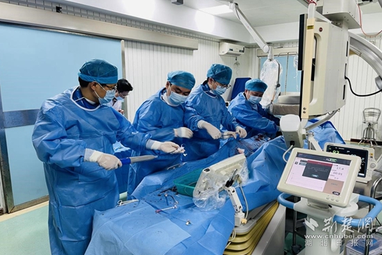 在完善各項術前檢查后,普外1科副主任陳加新,醫(yī)師柯章明、周義在華中科技大學同濟醫(yī)學院附屬協(xié)和醫(yī)院血管外科教授劉建勇的指導下,為患者成功施行了經(jīng)股動脈置管腹主動脈瘤覆膜支架置入術+右側髂動脈栓塞術。