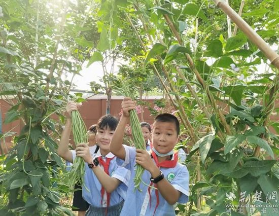頂著炎炎烈日,聞著泥土的芬芳。鄂州市葛店實驗四年級學(xué)生在老師、家長的帶領(lǐng)下走出“空調(diào)房”,到田間地頭開展蔬果采摘活動。只見孩子們伸起胳膊,踮起腳,仰著臉,小心翼翼地從藤蔓上摘下茄子、辣椒、西紅柿、豆角、大蔥、黃瓜等新鮮蔬果,不一會兒,手中的盆、桶就裝得滿滿當(dāng)當(dāng),大家驚喜地歡呼著,個個像凱旋的戰(zhàn)士。