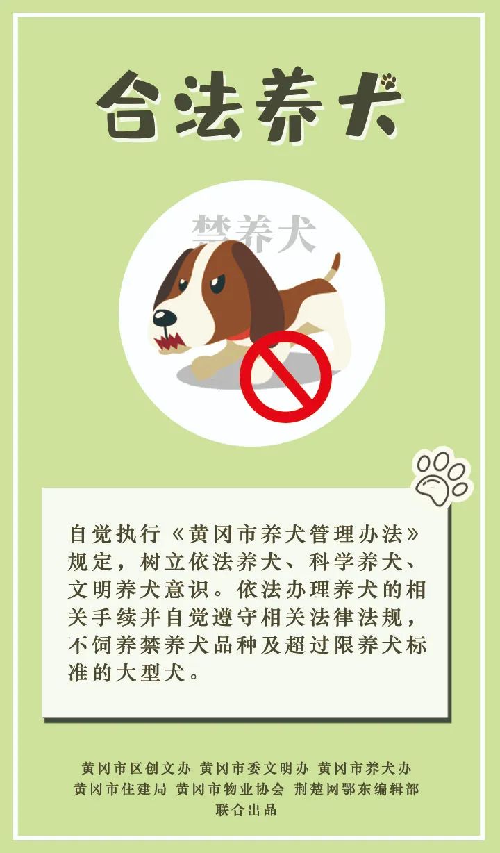 活動儀式上,黃岡市向廣大市民發(fā)出倡議:自覺依法文明養(yǎng)犬,共建和諧家園。做到合法養(yǎng)犬、文明養(yǎng)犬、衛(wèi)生養(yǎng)犬、安全養(yǎng)犬、健康養(yǎng)犬、科學(xué)養(yǎng)犬。