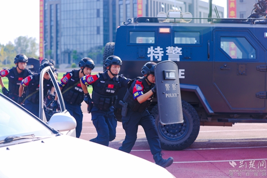 14點50分,隨著副市長、公安局長黃志勇一聲令下,警事技能大比武正式開始。大冶、陽新等7個縣(市)區(qū)公安機關和交巡警、特警等10個實戰(zhàn)單位分別進行警棍盾牌操戰(zhàn)術、擒敵拳戰(zhàn)術、實彈戰(zhàn)術射擊、應急救援等10個科目的警事技能比武。