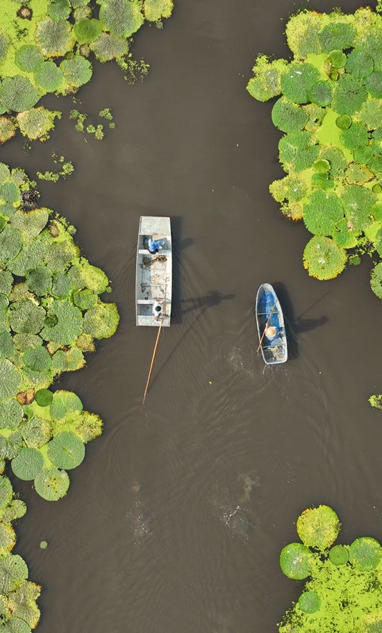 千百年來(lái),逐三山湖水系而作的漁民,深諳水性,以水為家,撒網(wǎng)捕魚(yú)?!拔⑽L(fēng)簇浪,散作滿河星”。入夜,漁歌四起,滿載星輝。