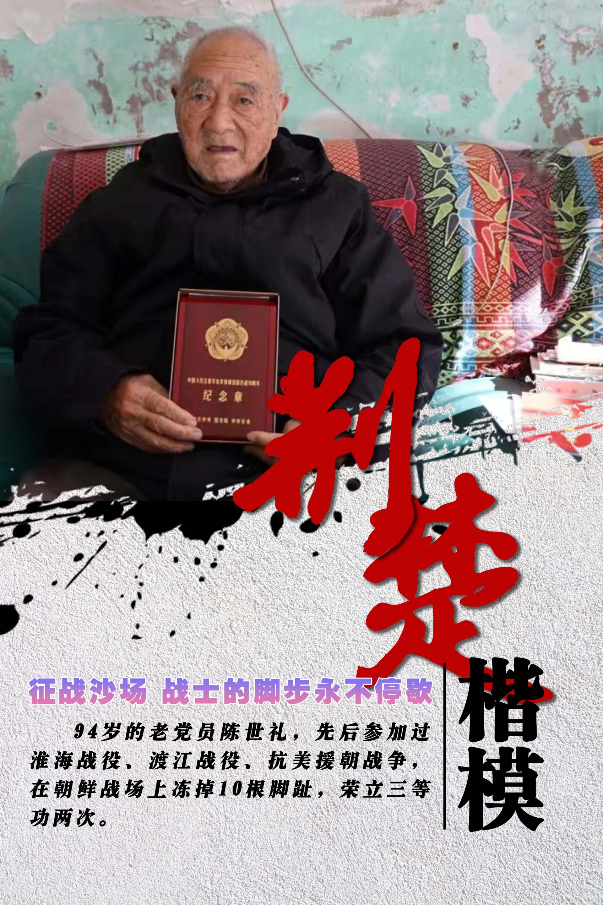 荊楚網(wǎng)(湖北日報網(wǎng))訊(通訊員 殷霞)陳世禮,男,1928年5月生,中共黨員,原湖北省黃岡市黃州區(qū)面粉廠黨支部書記。他先后參加淮海戰(zhàn)役、渡江戰(zhàn)役、抗美援朝戰(zhàn)爭,在朝鮮戰(zhàn)場上凍掉10根腳趾,兩次榮立三等功。1957年,陳世禮退役,主動選擇回到家鄉(xiāng),在黃岡糧食系統(tǒng)工作數(shù)十年。70多年來,他淡泊低調(diào),從不居功自傲、從不在人前顯耀。陳世禮曾榮獲“荊楚楷?!睒s譽。