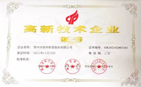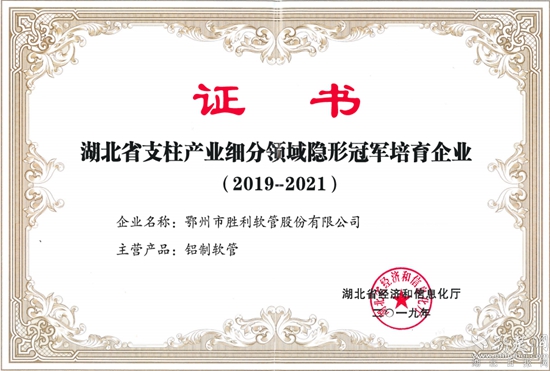 2019年,勝利軟管獲得湖北省支柱產(chǎn)業(yè)細(xì)分領(lǐng)域隱形冠軍培育企業(yè);2021年,勝利軟管獲得“湖北省高新技術(shù)企業(yè)”稱號(hào);2022年,勝利軟管成功入圍湖北省第四批專精特新“小巨人”企業(yè)。