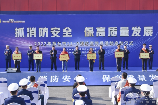 啟動(dòng)儀式上,黃石市消防救援支隊(duì)支隊(duì)長程雄鷹部署了消防宣傳月相關(guān)工作,市委宣傳部副部長丁元拾宣讀了《關(guān)于表彰全市優(yōu)秀消防志愿服務(wù)團(tuán)隊(duì)和消防宣傳志愿者的通報(bào)》,與會領(lǐng)導(dǎo)為獲獎(jiǎng)團(tuán)隊(duì)和個(gè)人代表頒發(fā)了獎(jiǎng)牌及證書。