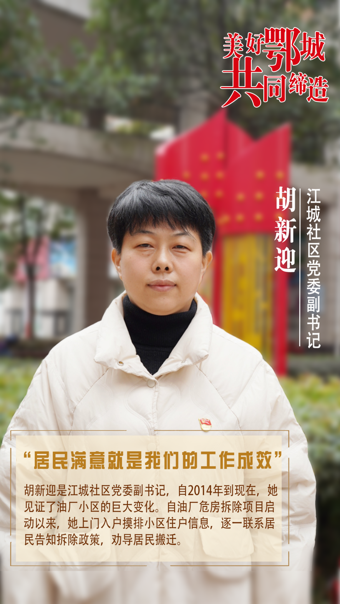 胡新迎是江城社區(qū)黨委副書記,自2014年到現(xiàn)在,她見證了油廠小區(qū)的巨大變化。自油廠危房拆除項目啟動以來,她上門入戶摸排小區(qū)住戶信息,逐一聯(lián)系居民告知拆除政策,勸導(dǎo)居民搬遷。