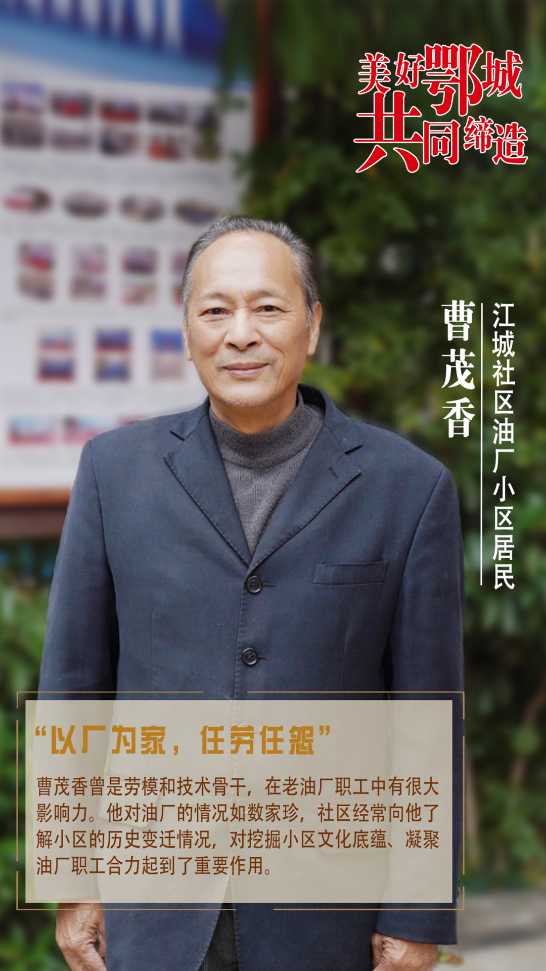 曹茂香曾是勞模和技術(shù)骨干,在老油廠職工中有很大影響力。他對油廠的情況如數(shù)家珍,社區(qū)經(jīng)常向他了解小區(qū)的歷史變遷情況,對挖掘小區(qū)文化底蘊、凝聚油廠職工合力起到了重要作用。