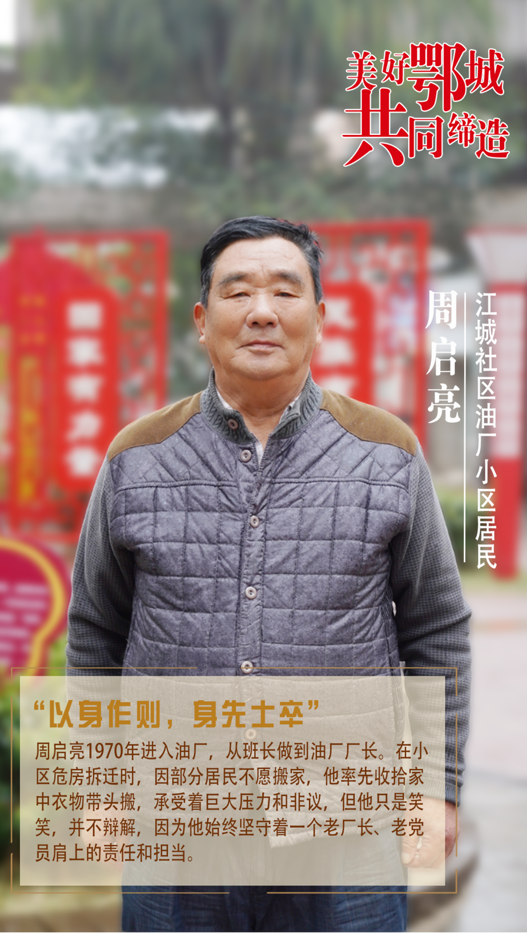 周啟亮1970年進入油廠,從班長做到油廠廠長。在小區(qū)危房拆遷時,因部分居民不愿搬家,他率先收拾家中衣物帶頭搬,承受著巨大壓力和非議,但他只是笑笑,并不辯解,因為他始終堅守著一個老廠長、老黨員肩上的責(zé)任和擔(dān)當(dāng)。