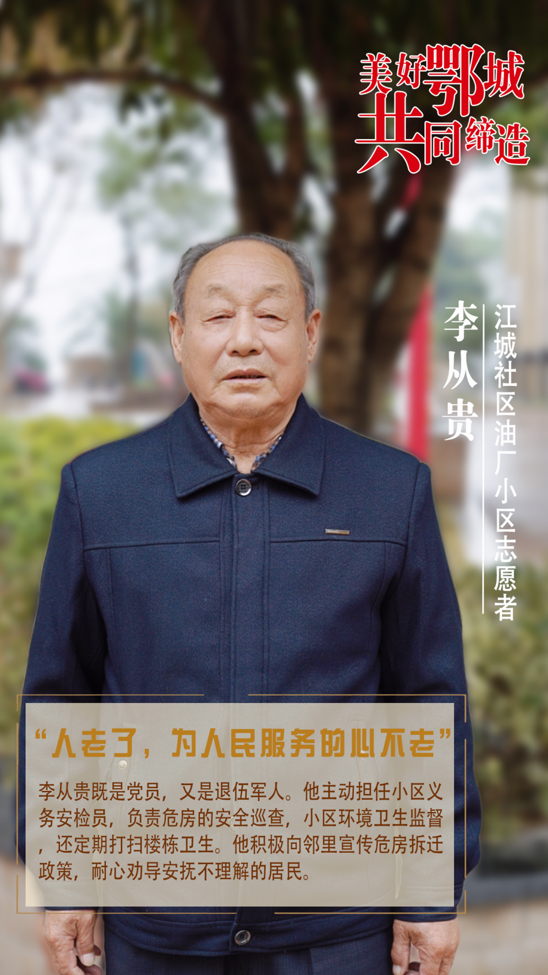 李從貴既是黨員,又是退伍軍人。他主動擔(dān)任小區(qū)義務(wù)安檢員,負責(zé)危房的安全巡查,小區(qū)環(huán)境衛(wèi)生監(jiān)督,還定期打掃樓棟衛(wèi)生。他積極向鄰里宣傳危房拆遷政策,耐心勸導(dǎo)安撫不理解的居民。
