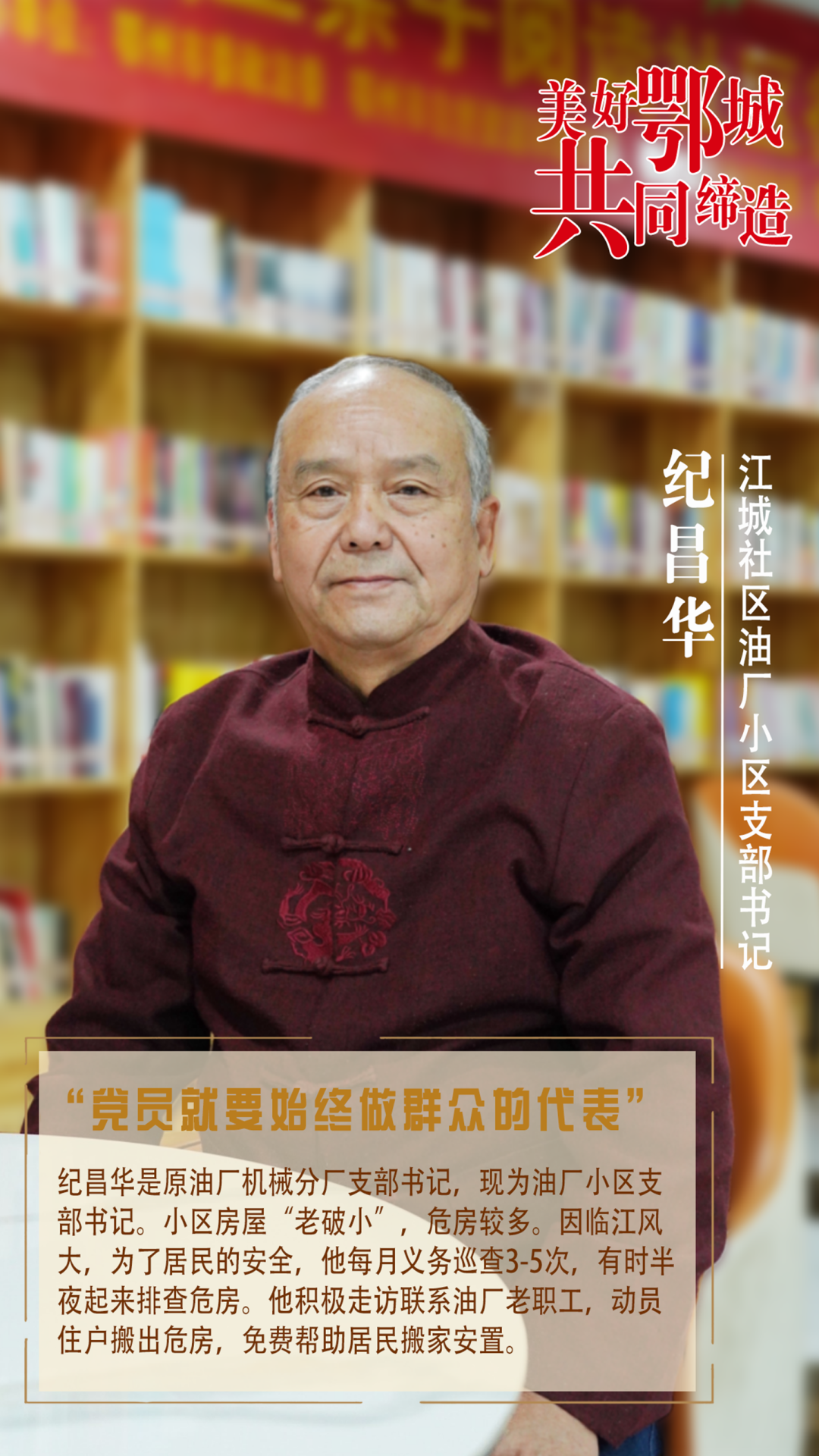 紀昌華是原油廠機械分廠支部書記,現(xiàn)為油廠小區(qū)支部書記。小區(qū)房屋“老破小”,危房較多。因臨江風(fēng)大,為了居民的安全,他每月義務(wù)巡查3-5次,有時半夜起來排查危房。他積極走訪聯(lián)系油廠老職工,動員住戶搬出危房,免費幫助居民搬家安置。