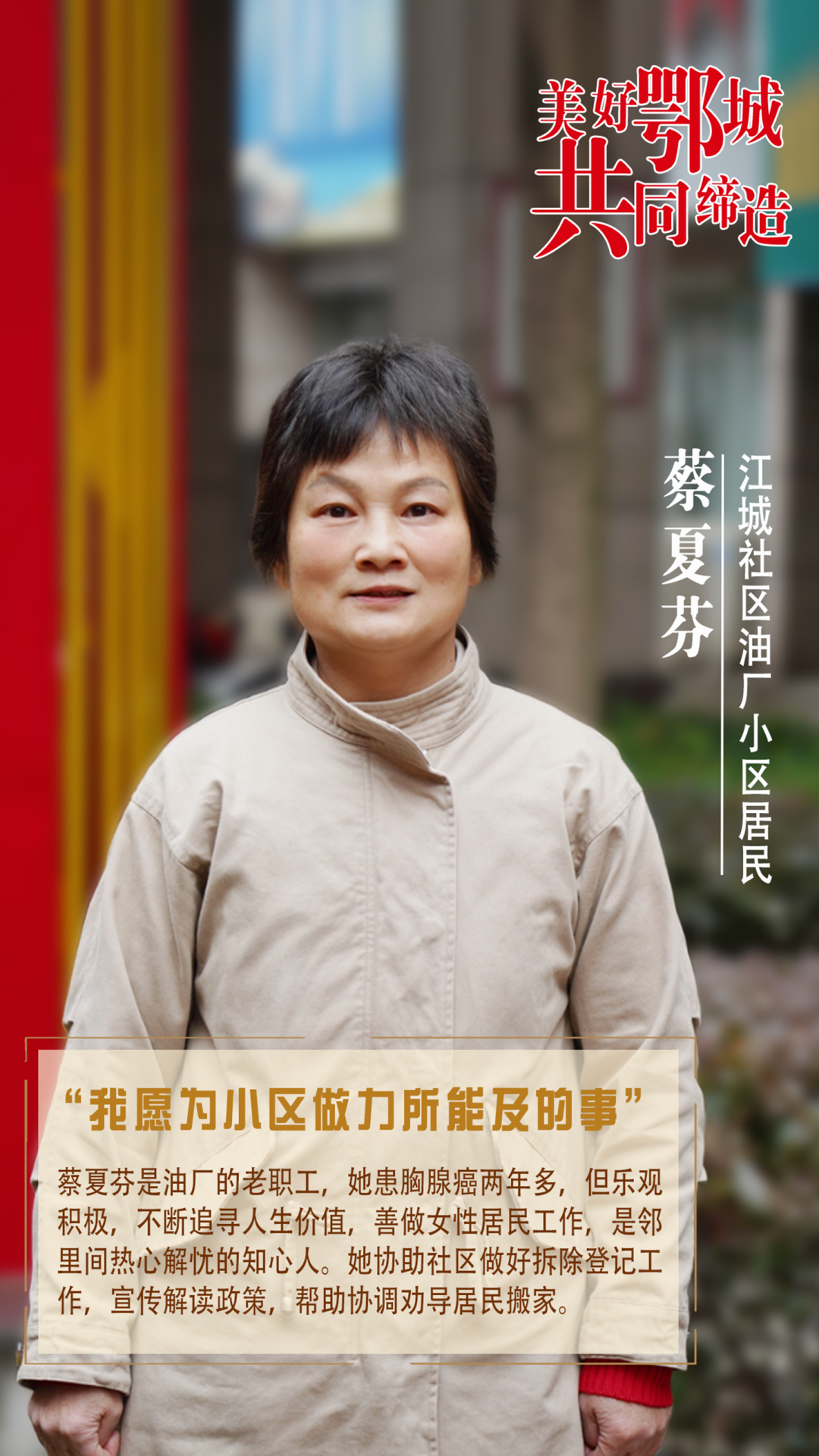蔡夏芬是油廠的老職工,她患胸腺癌兩年多,但樂觀積極,不斷追尋人生價值,善做女性居民工作,是鄰里間熱心解憂的知心人。她協(xié)助社區(qū)做好拆除登記工作,宣傳解讀政策,幫助協(xié)調(diào)勸導(dǎo)居民搬家。