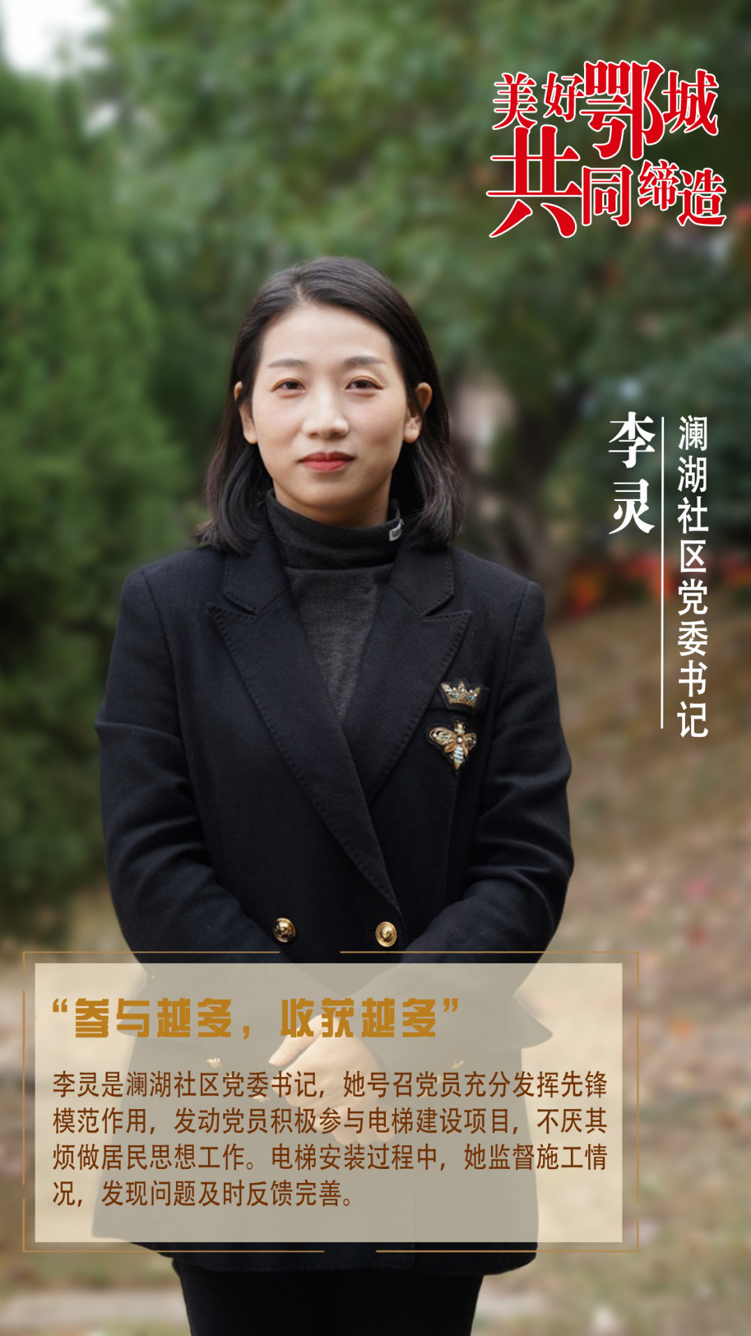 李靈是瀾湖社區(qū)黨委書記,她號(hào)召黨員充分發(fā)揮先鋒模范作用,發(fā)動(dòng)黨員積極參與電梯建設(shè)項(xiàng)目,不厭其煩做居民思想工作。電梯安裝過程中,她監(jiān)督施工情況,發(fā)現(xiàn)問題及時(shí)反饋完善。