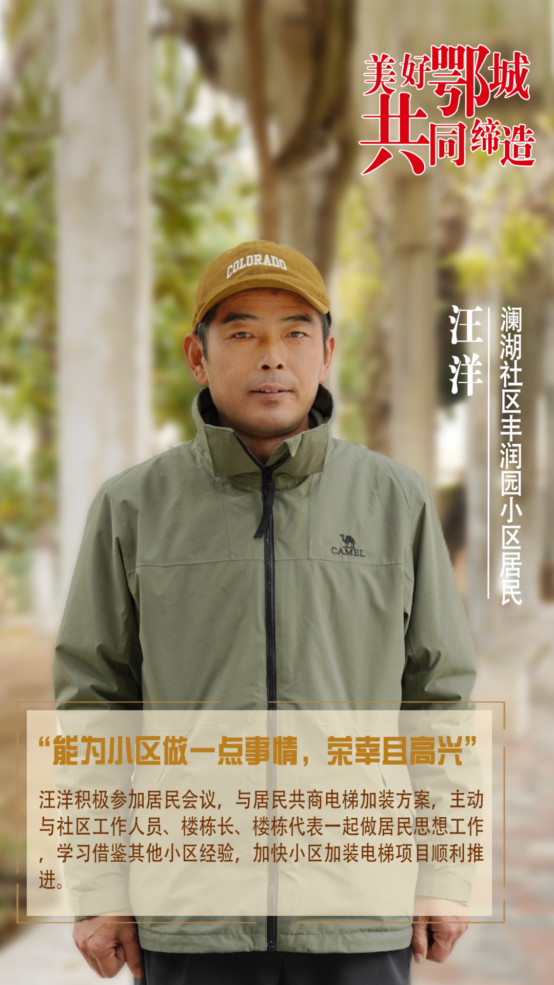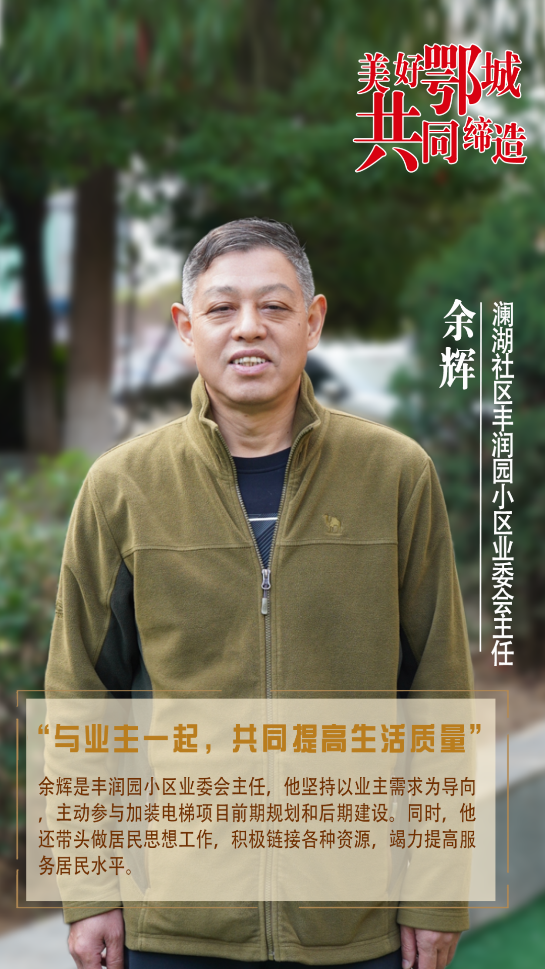 余輝是豐潤園小區(qū)業(yè)委會(huì)主任,他堅(jiān)持以業(yè)主需求為導(dǎo)向,主動(dòng)參與加裝電梯項(xiàng)目前期規(guī)劃和后期建設(shè)。同時(shí),他還帶頭做居民思想工作,積極鏈接各種資源,竭力提高服務(wù)居民水平。