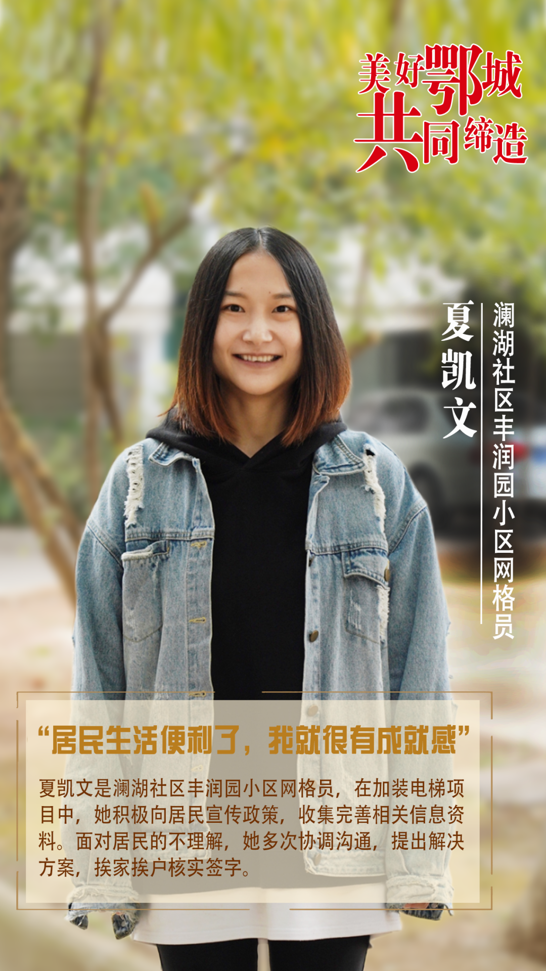 夏凱文是瀾湖社區(qū)豐潤園小區(qū)網(wǎng)格員,在加裝電梯項(xiàng)目中,她積極向居民宣傳政策,收集完善相關(guān)信息資料。面對(duì)居民的不理解,她多次協(xié)調(diào)溝通,提出解決方案,挨家挨戶核實(shí)簽字。