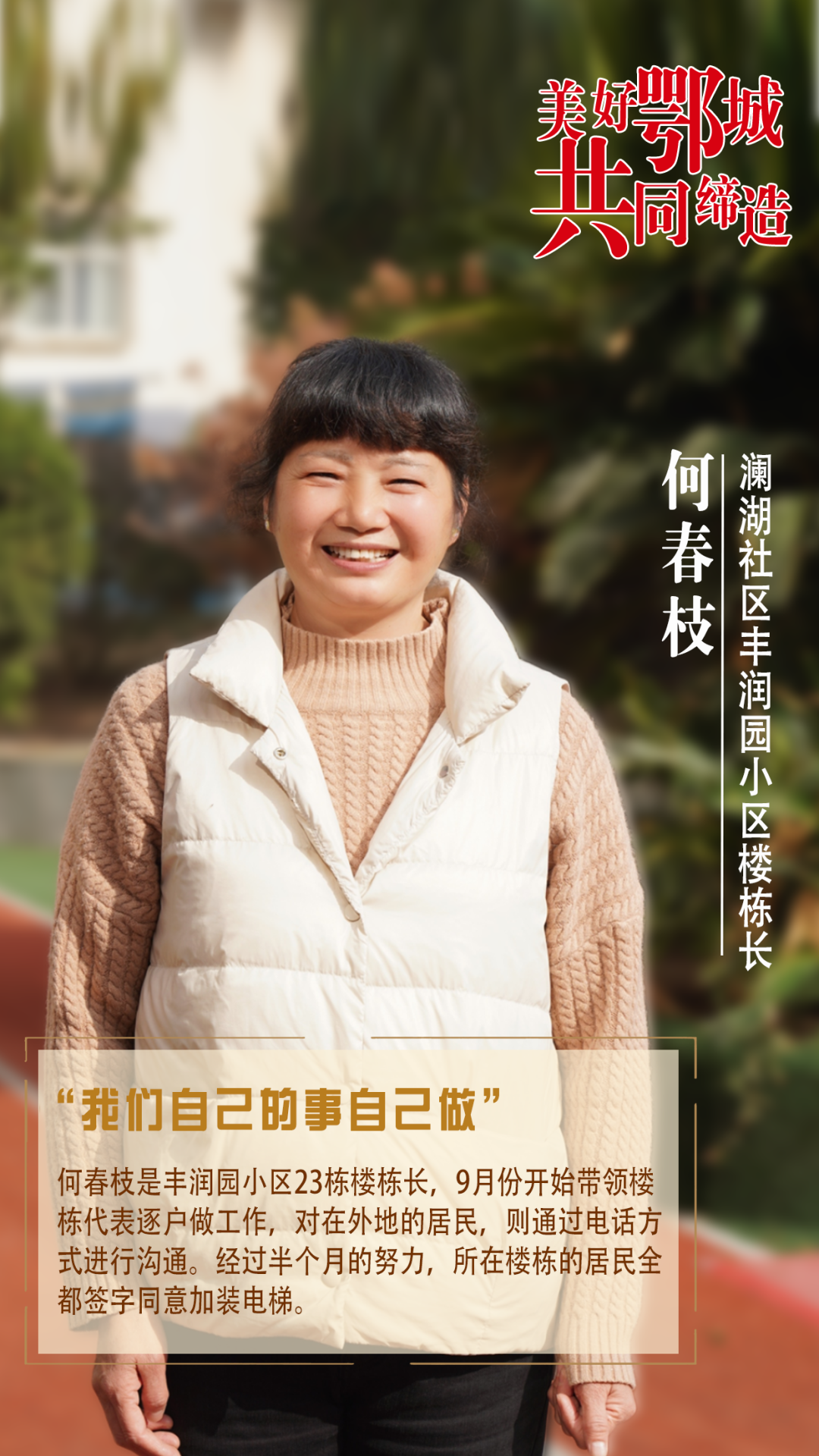 何春枝是豐潤園小區(qū)23棟樓棟長,9月份開始帶領(lǐng)樓棟代表逐戶做工作,對(duì)在外地的居民,則通過電話方式進(jìn)行溝通。經(jīng)過半個(gè)月的努力,所在樓棟的居民全都簽字同意加裝電梯。
