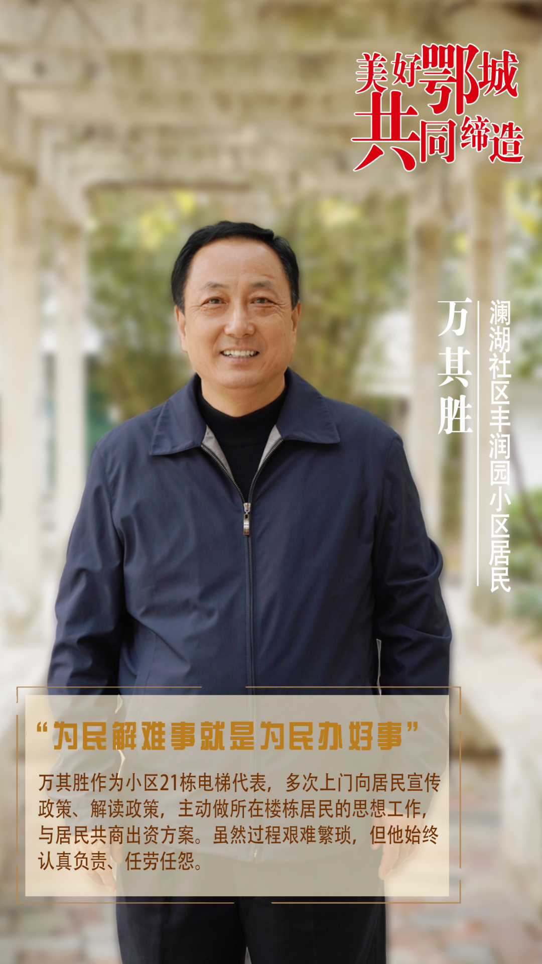 萬其勝作為小區(qū)21棟電梯代表,多次上門向居民宣傳政策、解讀政策,主動(dòng)做所在樓棟居民的思想工作,與居民共商出資方案。雖然過程艱難繁瑣,但他始終認(rèn)真負(fù)責(zé)、任勞任怨。