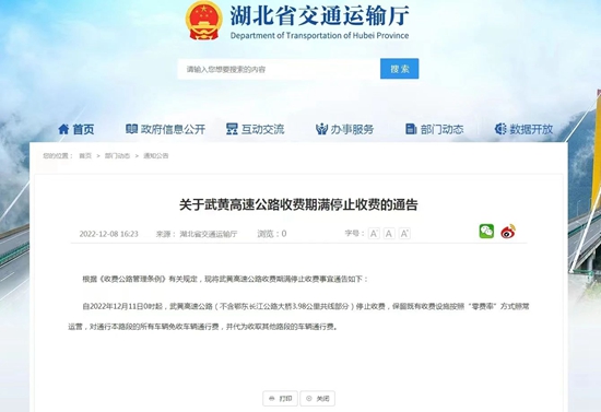 剛剛,湖北省交通運(yùn)輸廳發(fā)布關(guān)于武黃高速公路收費期滿停止收費的通告。