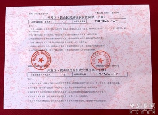 “這是我區(qū)年初推出試行房票安置制度后發(fā)放的首張房票,也是全市首張房票?!遍_發(fā)區(qū)·鐵山區(qū)住房保障局開發(fā)科科員王哲介紹,通過房票安置方式,一方面縮短了拆遷群眾安置時間,另一方面拓寬了安置房源,打通住房轉換通道后,拆遷群眾可以根據(jù)個人需求購買心儀的商品房用來安置,選擇范圍更大了、居住環(huán)境更好了、生活品質更高了。