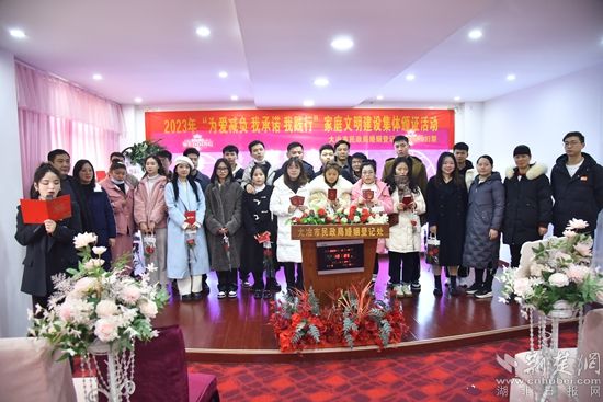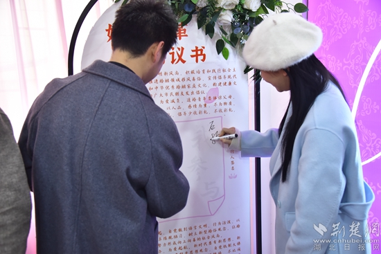 荊楚網(wǎng)(湖北日?qǐng)?bào)網(wǎng))訊(通訊員 杜巧云、石姣、陳?。?/strong>“我承諾:抵制高價(jià)彩禮,為愛減負(fù),拒絕低俗婚鬧,為愛守禮,主張婚事簡(jiǎn)辦,為愛啟航,傳承優(yōu)秀文化,為愛踐行……”2月14日上午,大冶市婚姻登記處為當(dāng)日上午登記領(lǐng)證的50對(duì)新人舉行“為愛減負(fù),我承諾、我踐行”集體頒證活動(dòng),新人們?cè)谶@個(gè)特殊的日子集體宣誓并在《婚俗改革倡議書》上簽字承諾。