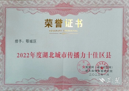《2022年度湖北城市傳播力十佳區(qū)縣》證書。通訊員 供圖