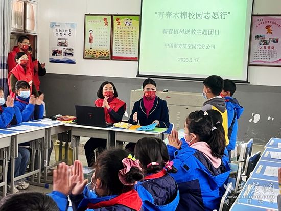 “因?yàn)槲覀児镜? Logo是木棉花,它寓意珍惜眼前,所以我們的活動(dòng)命名為‘楚天木棉進(jìn)校園’,希望能夠引導(dǎo)孩子們珍惜時(shí)光,好好學(xué)習(xí),將來(lái)更好地‘走出去’!”南航公司駐余涼村工作隊(duì)長(zhǎng)董剛?cè)缡墙榻B。