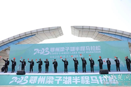 活動現(xiàn)場,中共鄂州市委書記孫兵,湖北省體育局二級巡視員胡晶珊,鄂州市人大副主任周秀華,鄂州市委常委、宣傳部部長鄒霞,鄂州市委常委、副市長盧輝,鄂州市副市長、公安局長方勇,鄂州市副市長邱實,鄂州市政府黨組成員李梁軍共同為比賽鳴槍發(fā)令。一聲整齊的發(fā)令槍聲響徹云霄,打響了2023鄂州梁子湖半程馬拉松起跑的號角。