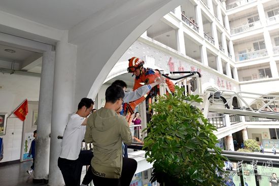 “火災(zāi)”發(fā)生后,學(xué)校立即啟動應(yīng)急疏散預(yù)案:由老師組織學(xué)生有序疏散、安保人員進行初期火災(zāi)撲救,同時撥打119電話報警。消防人員到場后迅速開展滅火救援,并利用云梯消防車成功解救兩名行動不便的被困高樓層的學(xué)生。