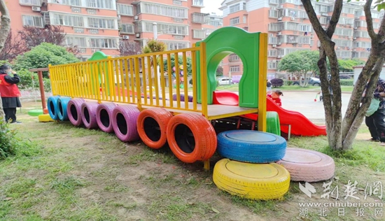 荊楚網(wǎng)(湖北日?qǐng)?bào)網(wǎng))訊(通訊員 丁元中)近日,鄂城區(qū)西山街道石山社區(qū)觀瀾花園小區(qū),經(jīng)過(guò)創(chuàng)意涂鴉,廢舊輪胎“搖身一變”,成了一個(gè)個(gè)色彩斑斕的彩色衣裳,不少兒童正在輪胎搭建而成的滑梯、蹺蹺板、秋千等娛樂(lè)設(shè)施上面玩耍。一旁的健身器材上,一些老人正在鍛煉身體,原來(lái)空無(wú)一物的休閑廣場(chǎng)已成為一個(gè)廣受居民歡迎的新去處。