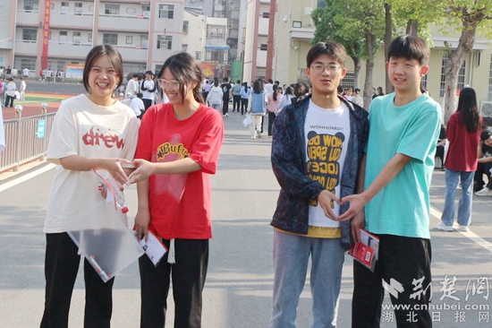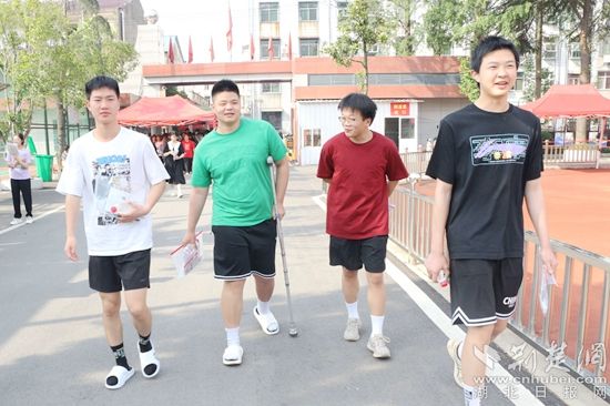 他們當(dāng)中有的考生身穿紅色衣服,預(yù)??荚嚧蠼?;在進(jìn)考場前,有的考生圍在一起,擺出愛心的手勢,露出自信的笑容,高呼“戰(zhàn)勝高考,我能,我一定能”的口號響徹云霄;有的考生雖然在考前腿部或頭部受傷,但他們沒有顯示畏懼的神態(tài),反而展現(xiàn)了更堅(jiān)強(qiáng)的毅力與一往無前的勇氣,面帶笑容,堅(jiān)定地邁入考場……一幕幕從容的畫面詮釋著勇毅前行,一張張自信的笑臉展示著超越自我。
