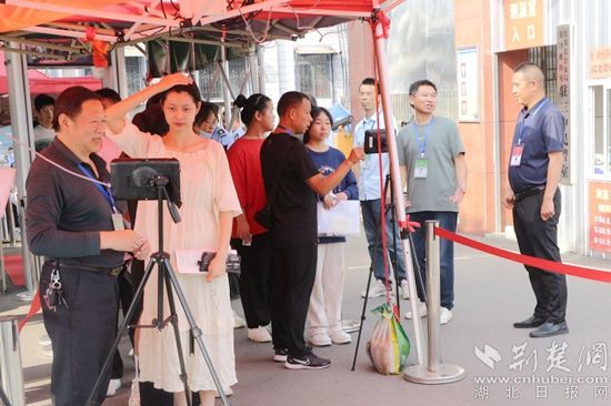 現(xiàn)場,考生排著整齊的隊(duì)伍,接受考點(diǎn)身份驗(yàn)證及安檢檢查,陸續(xù)步入考場。