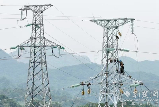 荊楚網(湖北日報網)訊(通訊員 周燁任 曹浩)6月12日,在黃石陽新縣富陽公路和黃陽公路沿途110千伏宋竹線輸電線路改造現場,電力工人站在高高的鐵塔上,頭頂驕陽展放導線,全力迎戰(zhàn)夏季用電高峰。
