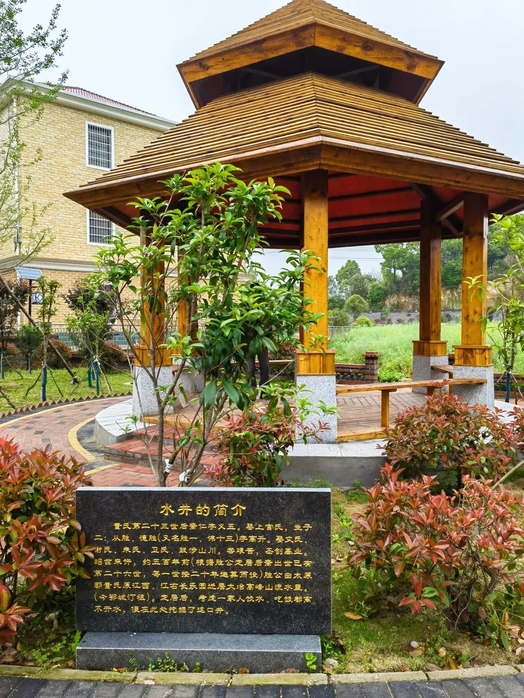 將農(nóng)具鑲嵌在墻上村民休憩的長廊與涼亭