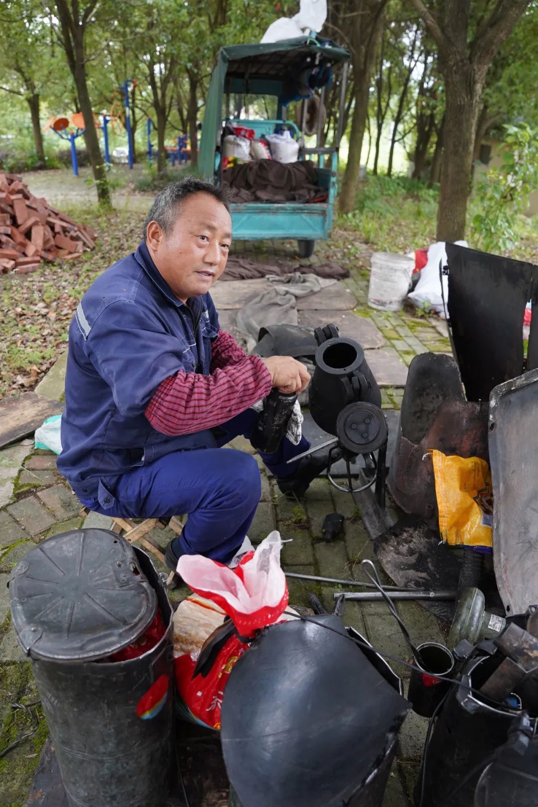 老人手握一把空氣錘