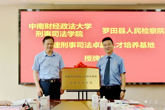 當(dāng)天,中南財經(jīng)政法大學(xué)刑事司法學(xué)院與羅田縣人民檢察院舉行共建刑事司法卓越人才培養(yǎng)基地簽約揭牌儀式,中南財經(jīng)政法大學(xué)刑事司法學(xué)院院長胡向陽,羅田縣人民檢察院黨組書記、檢察長汪輝為檢校共建協(xié)議簽約,為“刑事司法卓越人才培養(yǎng)基地”揭牌。