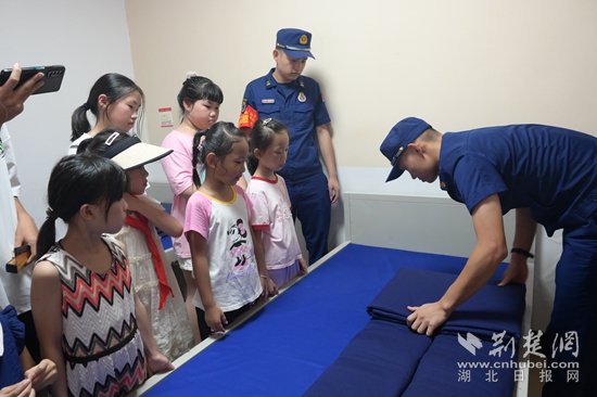 孩子們還走進了消防員的宿舍,看到疊得如同豆腐塊般的被子,大家紛紛豎起了大拇指,都被消防員高度的自律性所震撼。消防員為青少年講解了“豆腐塊”被子的疊法,大家學習熱情高漲,紛紛模仿、動手操作?!敖裉斓膮⒂^讓我感受到了消防叔叔們的勇敢和擔當。我以后也要成為一名光榮的消防員,守護大家的安全和平安?!币晃粎⒓踊顒拥男∨笥颜f道。