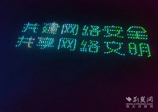 夜空中,數(shù)百架無(wú)人機(jī)以天空為畫布、以光影為畫筆,描繪出一幅幅科技與視覺(jué)的“大片”。表演融入網(wǎng)絡(luò)視聽元素和黃石、湖北地標(biāo)內(nèi)容,依次幻化成小燕子、天空之城、黃石歡迎你、地球、安全盾牌等11個(gè)畫面,最終匯集成“共建網(wǎng)絡(luò)安全 共享網(wǎng)絡(luò)文明”的字樣。