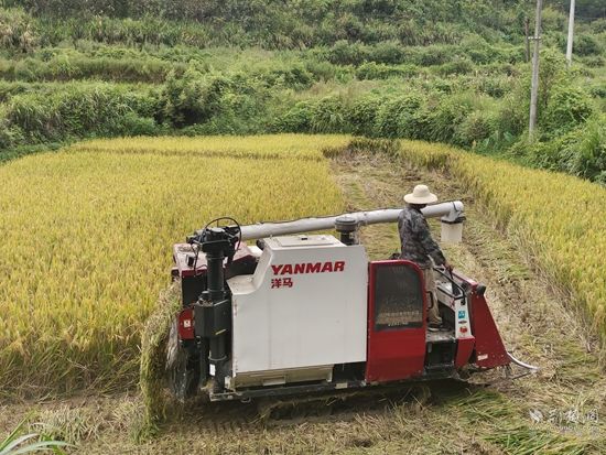 荊楚網(wǎng)(湖北日報網(wǎng))訊(通訊員 吳儀)11月6日,通山縣南林橋鎮(zhèn)湄溪村鄉(xiāng)林合作社再生稻種植基地上千余畝水稻大部分收割完畢,收割機(jī)在稻田里穿梭收尾,一株株稻穗換來金燦燦的稻粒,鄉(xiāng)間沃野一派豐收景象。